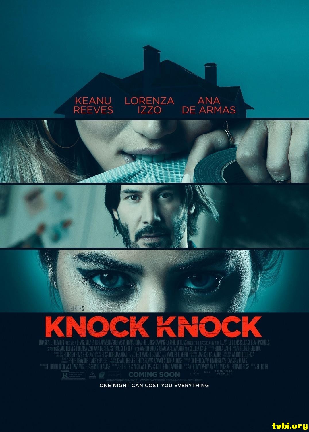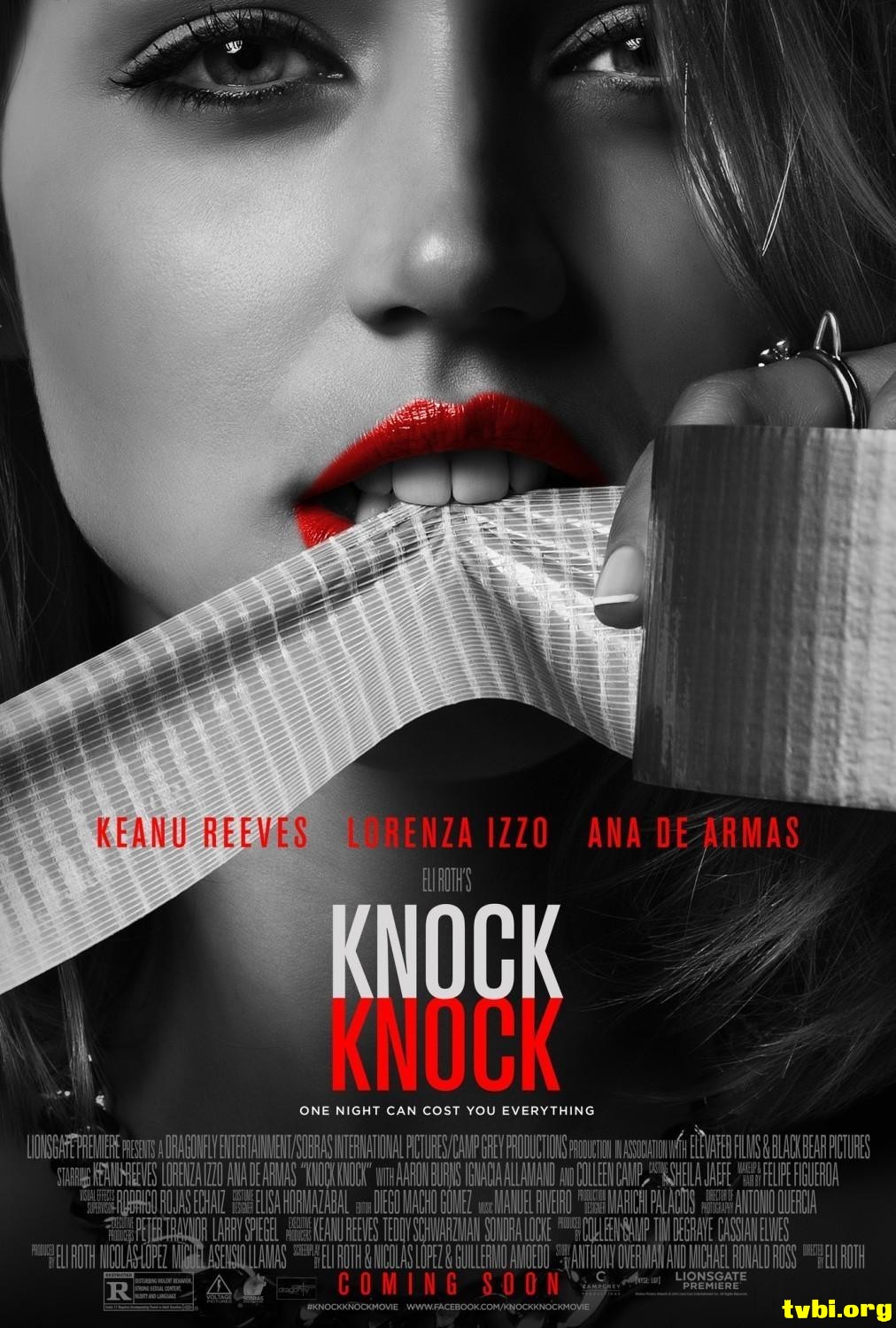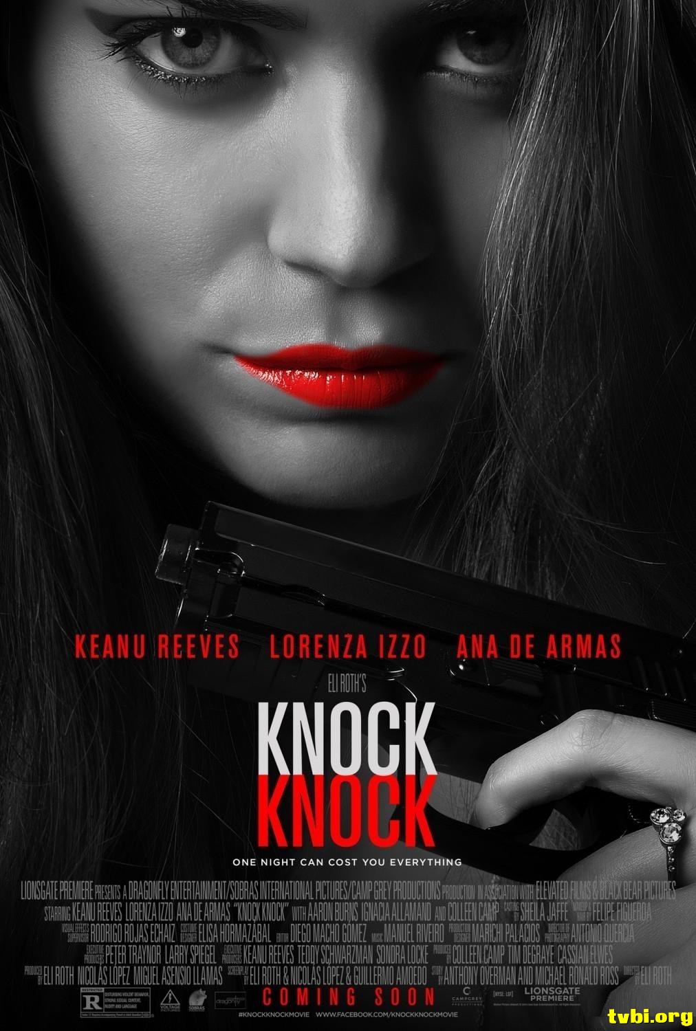 中文片名:當辣妹來敲門/敲敲门 英文片名:Knock Knock 影片類別:恐怖/驚悚 制片國別:美國 影片導演:《恐怖旅舍》伊萊羅斯 Eli Roth 卡司阵容:《捍衛任務》基努李維 Keanu Reeves, 《謊言性派對》安娜德哈瑪絲 Ana de Armas, 《劫後餘生》蘿蘭莎伊柔 Lorenza Izzo ★美國獅子門影業(Lionsgate)高價搶下美國發行權 ★日舞影展午夜單元正式入選,《恐怖旅舍》鬼才導演 伊萊羅斯 玩轉類型電影創意新作 ★《捍衛任務》性格男星 基努李維 顛覆救世主形象,單槍直搗性感浪女三人行 剧情简介: 事業有成的建築師伊凡(基努李維 飾),他的美滿生活令人稱羨──不但擁有美貌嬌妻與可愛的孩子,還坐擁一棟城堡般的華-麗豪宅!在他人眼中,伊凡是一位再幸福不過的新好男人和模範父親,沒想到這平靜的小確-幸卻不持久……在一個大雨滂沱的周末夜晚,兩名衣衫溼透的年輕辣妹出現在伊凡家門口,-原本以為是天上掉下來的齊人豔遇,之後的展開卻將他美夢般的生活,狠狠變為宛如地獄的-生猛噩夢! 时光网讯: 伊莱·罗斯执导、基努·里维斯主演的恐怖电影《敲敲门》发布全新预告。基努·里维斯在本片中饰演一名看似幸福的家庭妇男埃文,妻儿不在家的雨夜,两名陌生妙龄女郎上门投宿。然而这个看似“香艳”的电影看头,之后却有“神转折”。 两位女郎先是给结婚十四载的埃文洗脑“跟一个人在一起那么久简直灭绝人性”,之后又使出色诱的杀手锏。嘴里说着“不要,不要,我结婚了”的埃文最终半推半就地地出了轨。事后的愧疚感令他立即想让两位女郎消失,然而她们却像牛皮糖一样甩也甩不掉。最后,她们竟然以埃文欺骗家庭的名义要将他就地正法,而里维斯的逃命之旅才刚刚开始…… 《敲敲门》即将于10月9日通过院线及视频点播渠道北美上映,在此之前导演伊莱·罗斯执导的另一部电影《绿色地狱》也将在9月25日进入北美院线。相比而言,《敲敲门》中的血浆用量显然会少一点,而里维斯与伊莱·罗斯的合作也十分令人期待。